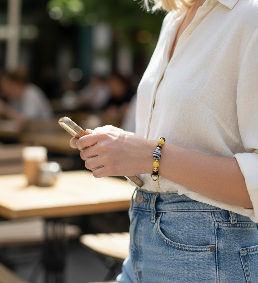 Black zebra stripe agate, citrine, calcite bead bracelet