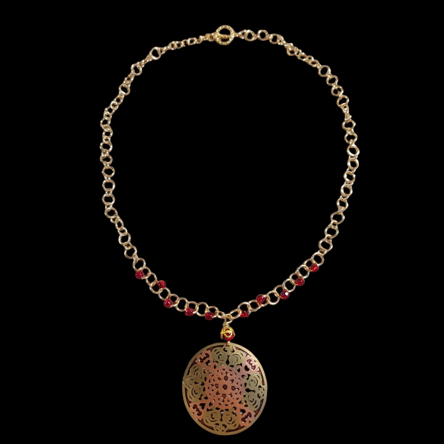 Brass, copper round pendant with red glass beads, 14 kt gold filled clasp and gold metal jump ring chain. Matching earrings available. The necklace measures 22 inches in length. E053 are matching earrings for reference.