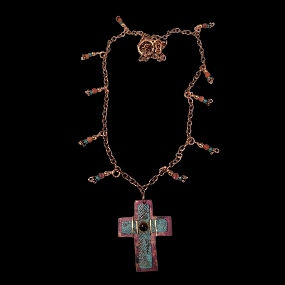 Green patina/copper cross ,, copper bead dangles, copper findings, chain and clasp necklace.